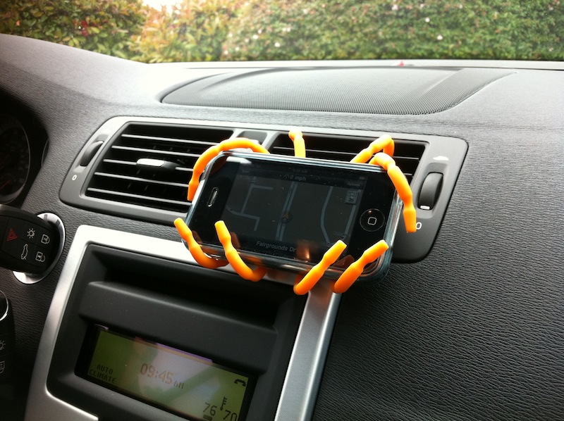 The Breffo Spiderpodium is neat little gadget that’s shaped like a spider and bendable so that you can form it into a stand or mount for just about anything. I used mine to hold mount my iPhone on the dashboard of our rental car by hooking it into an air vent. Worked like a charm and required no cursing whatsoever.