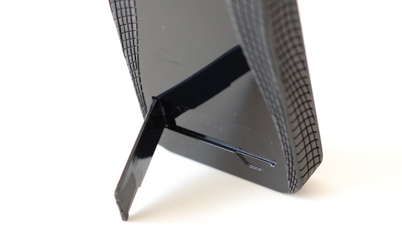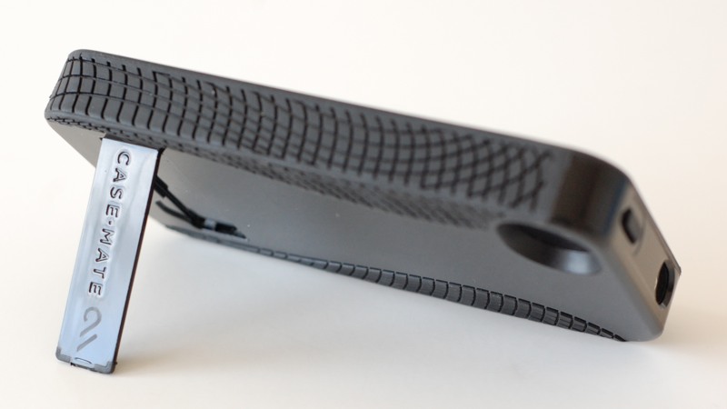 The flip-out stand on the rear is made of the same glossy plastic as the rest of the majority of the case and is stamped with the Case-Mate name and logo. Below the edge side that flips out is a small cut-out so you can slip your fingernail underneath it to flip it out.