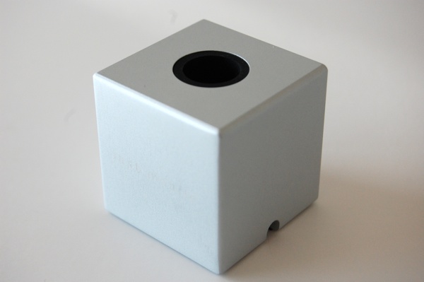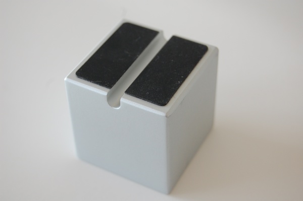 The AluCube is made out of a solid block of aluminum weighing in at almost 5.5 ounces (150 grams) on the food scale in my kitchen. It has a matte finish that matches Apple’s current product line-up almost perfectly. The Just Mobile logo is lightly etched on one side and is actually a little difficult to see unless you’re looking for it (yay for discreet branding!).